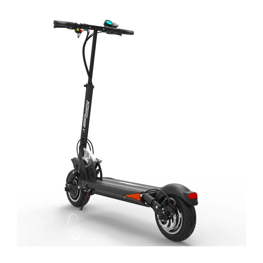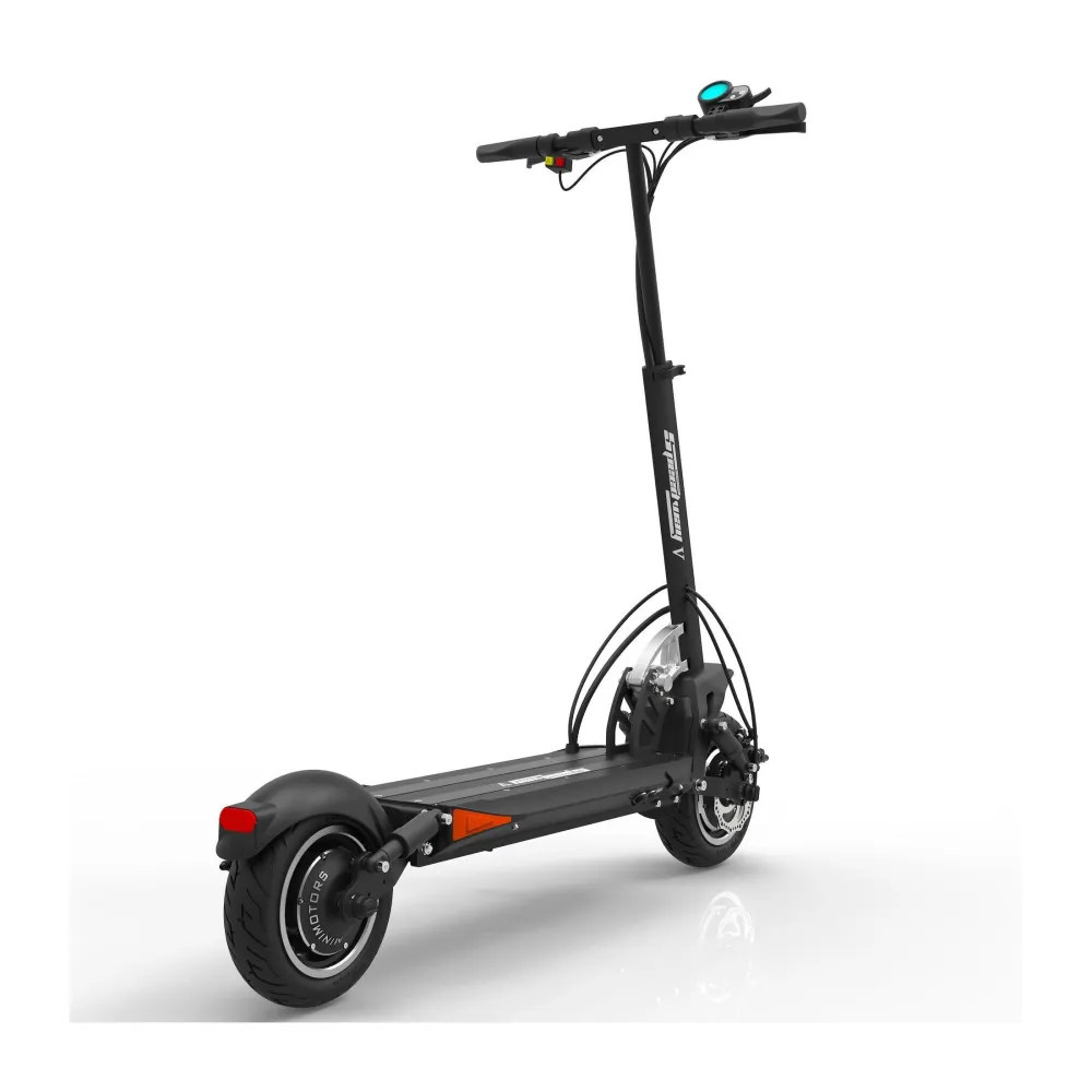 Заявленная максимальная скорость 65 км, это делает самокат скоростным, те кто любит быстрое движение, оценят. Широкие колеса 10 дюймов придают устойчивости и уверенности в повороте, на каждое колесо предусмотрен дисковый тормоз, есть функция рекуперации, ABS система.