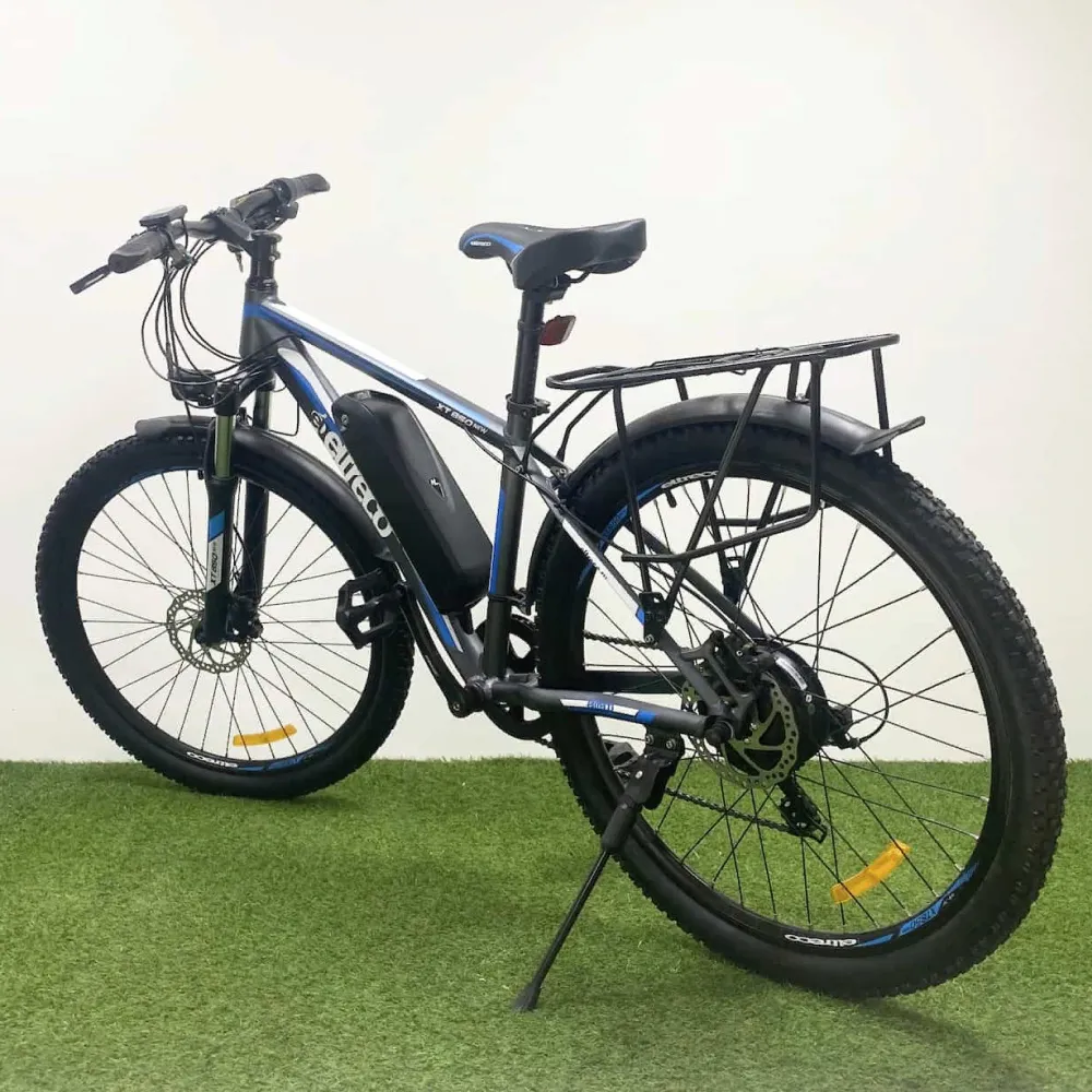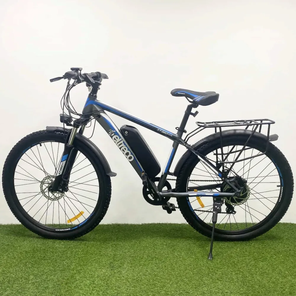 Не желаете терпеть компромиссов, стремитесь к совершенству, предлагаем обратить внимание на велогибрид Eltreco XT 850 new. Черно-синий электровелосипед предназначен для загородных прогулок и езды по горной местности. Из особенностей техники следует выделить: